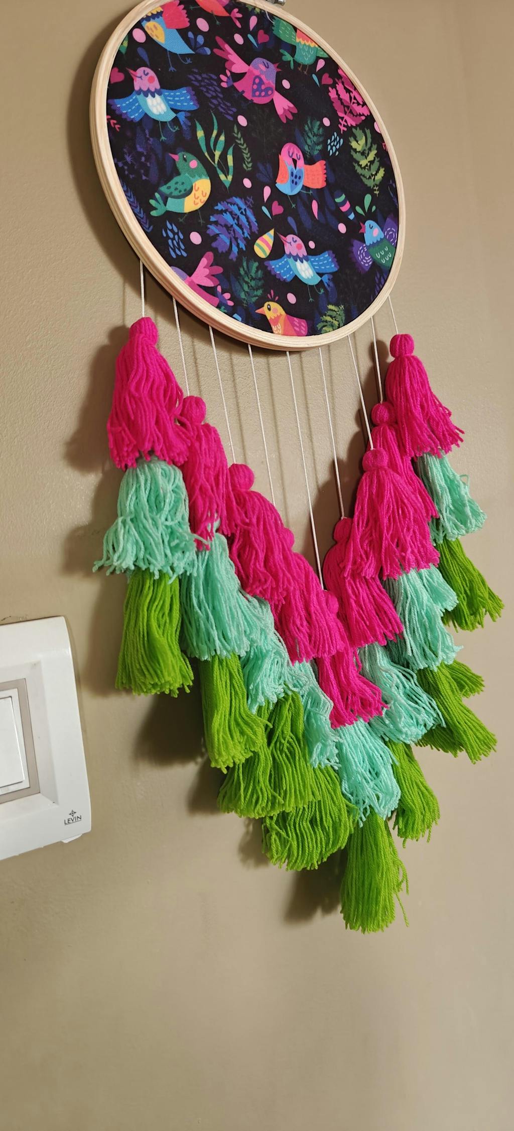 This dream catcher with bird print is just what you need to uplift your home décor. The fluffy shade of pink & green tassels hanging on them blend beautifully with any ambience and adds to the charm of the dream catcher.