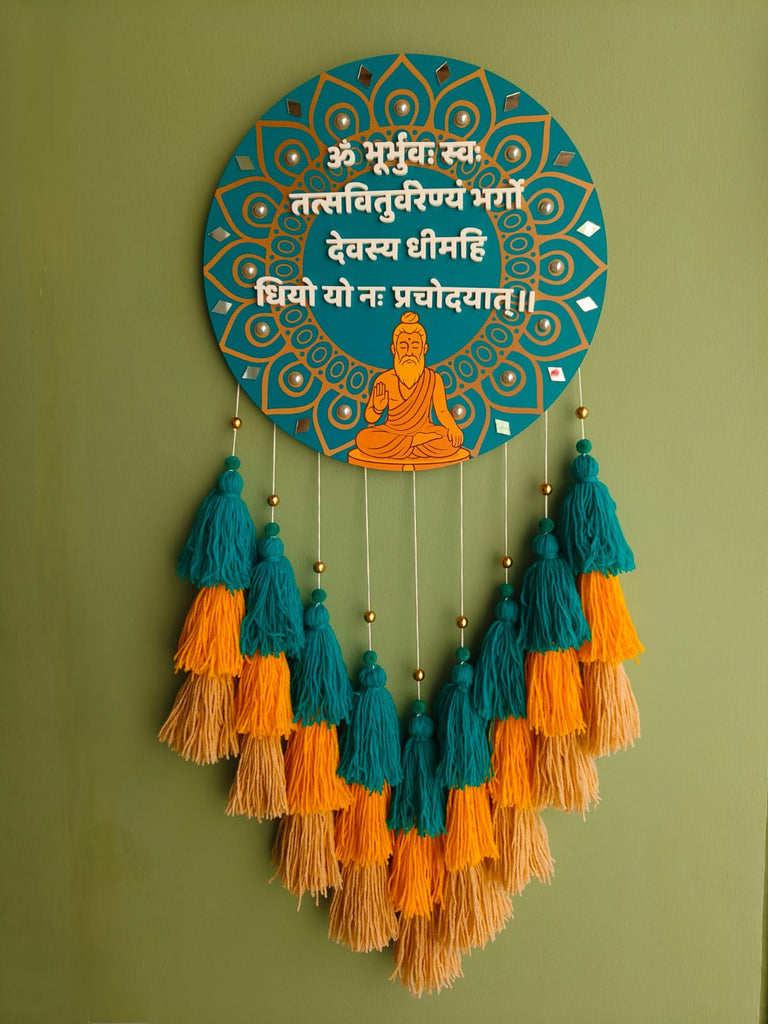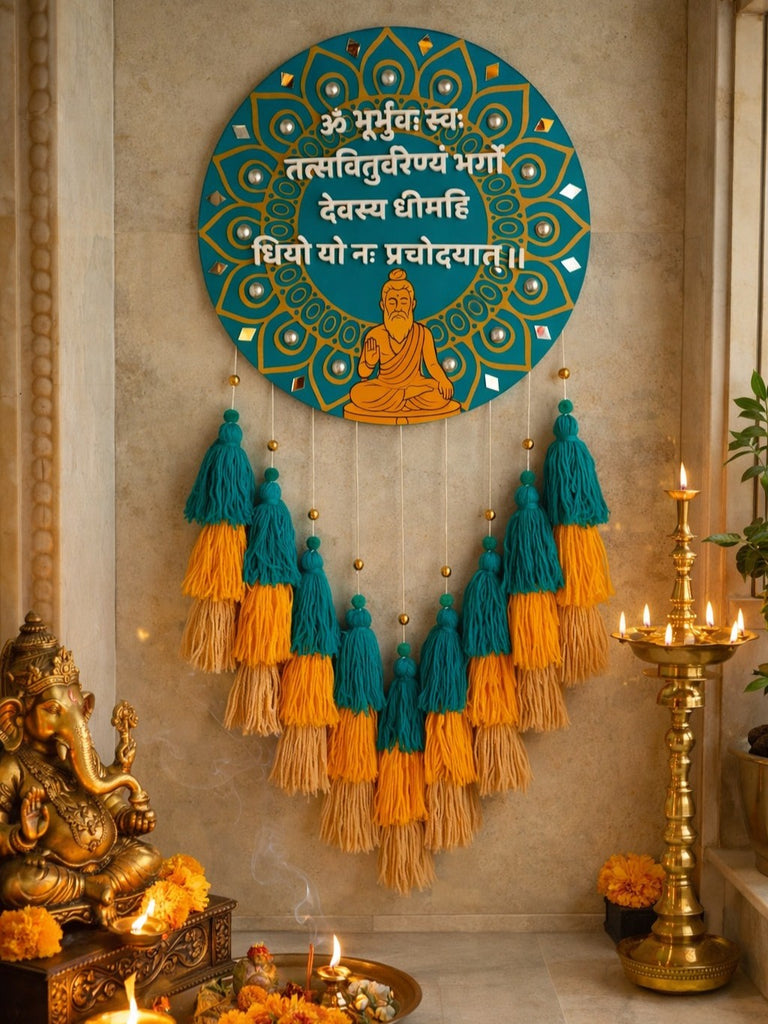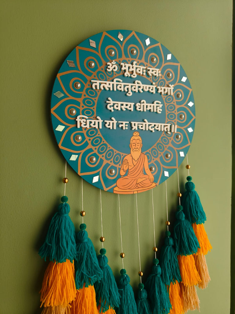 Infuse your space with sacred vibrations through our beautifully handcrafted Gayatri Mantra Mandala Wall Hanging. Designed on a rich teal circular base with intricate golden mandala detailing, this piece features the powerful Gayatri Mantra in raised lettering — a timeless prayer for wisdom, clarity, and enlightenment.