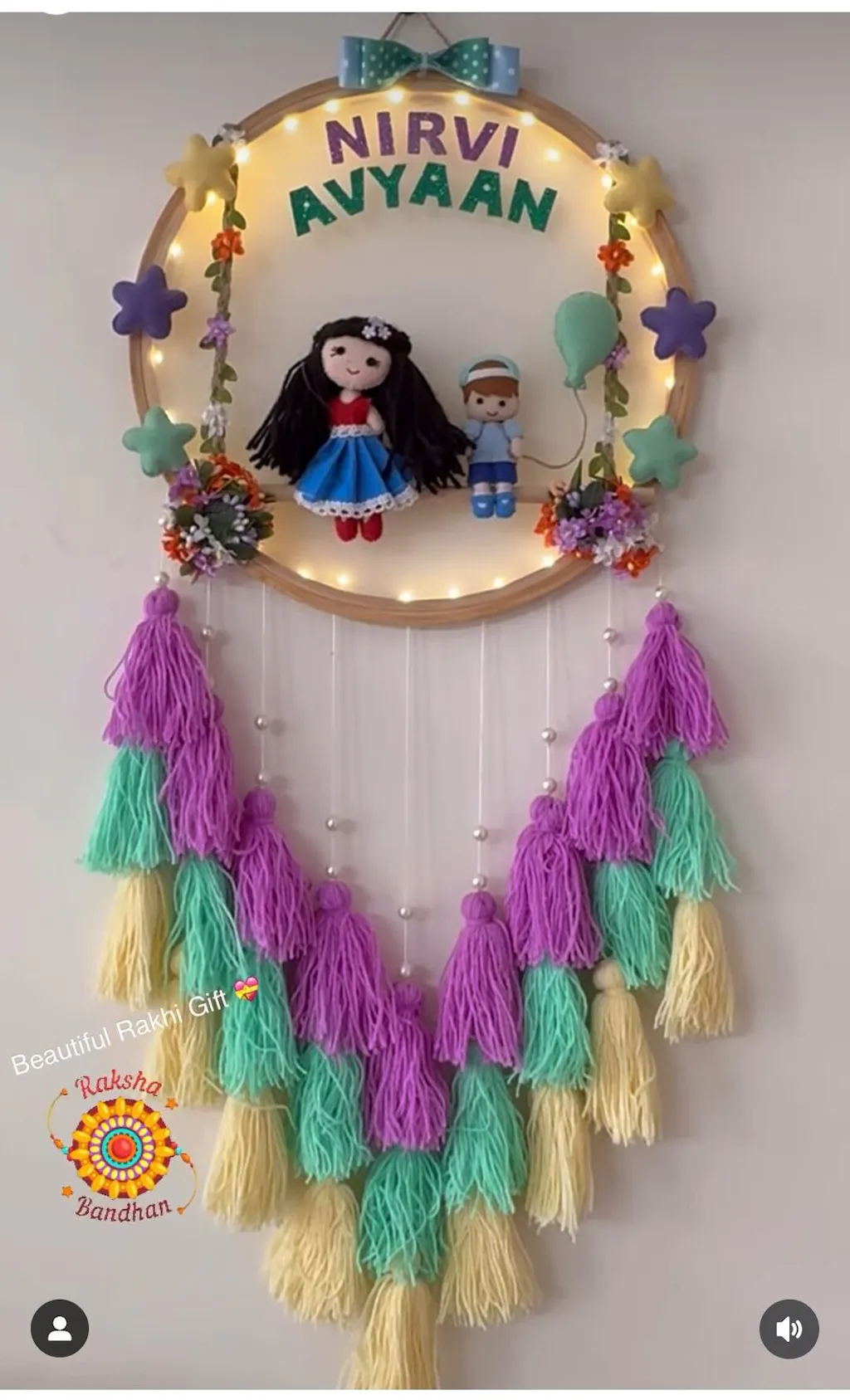 Brighten up any space with this handcrafted name hoop, featuring an adorable couple of felt dolls and vibrant tassels! Perfect for kids’ rooms, nursery decor, or as a memorable gift for birthdays, baby showers, or housewarming celebrations.