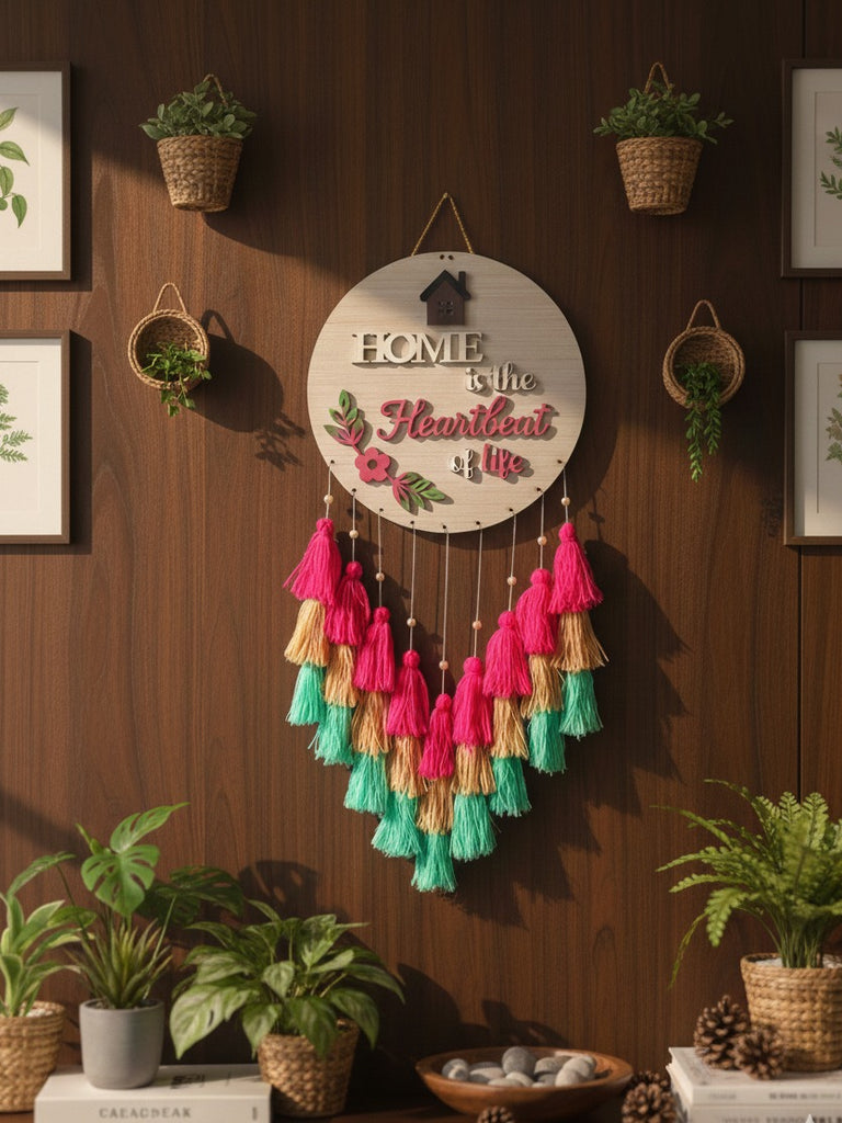 Turn your house into a heartfelt home with this beautifully handcrafted wall hanging that celebrates warmth, love, and togetherness. Designed on a soft wooden base with layered 3D lettering and finished with vibrant handmade tassels, this piece adds charm and personality to any space it graces.
