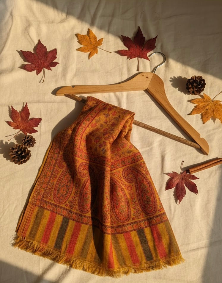 Drenched in warm amber tones and detailed with intricate paisley motifs, this stole is a celebration of timeless craftsmanship. The rich border and delicate patterns create a regal statement, while the soft fabric ensures all-day comfort. Perfect for festive gatherings, winter layering, or elevating everyday ethnic wear.
