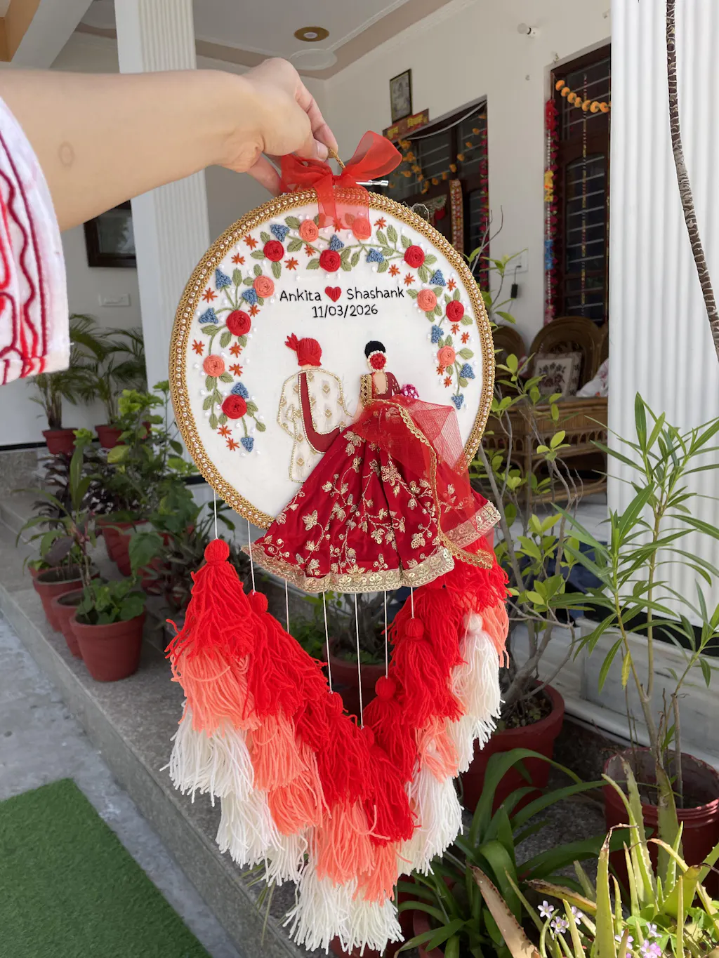 Make any dates memorable with these intricately embroidered Bride & Groom Calendar wall hanging. You can customize the couple's name and date on it and gift it your loved one in a unique way for an anniversary or wedding gift. The red lehenga with dupatta with shade of red, pink & cream colored tassels complement the calendar hoop perfectly.
