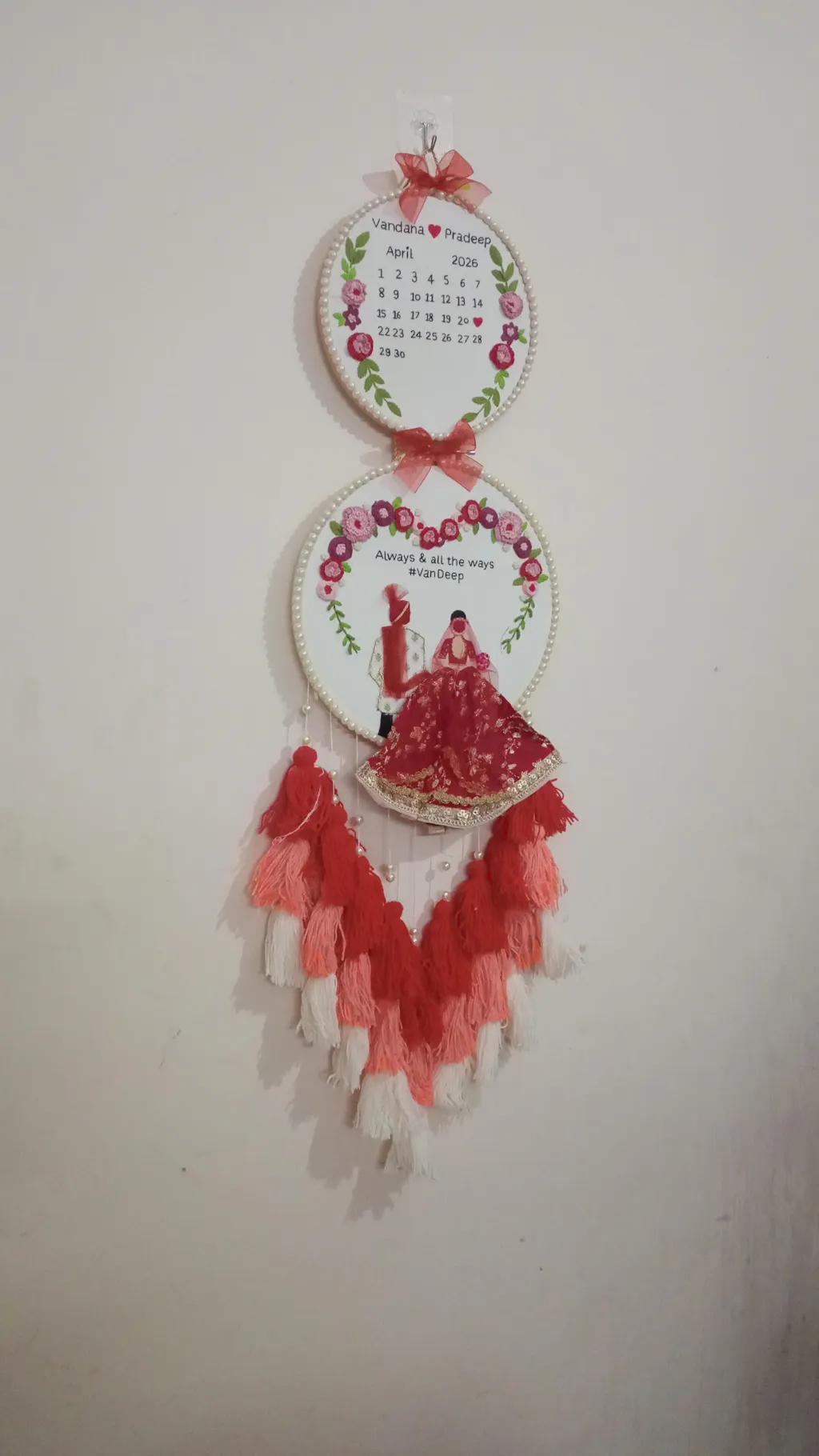 Make any dates memorable with these intricately embroidered Bride & Groom Calendar wall hanging. You can customize the couple's name and date on it and gift it your loved one in a unique way for an anniversary or wedding gift. The Lehenga and the shade of Red, Baby Pink & Cream colored tassels complement the calendar hoop perfectly.