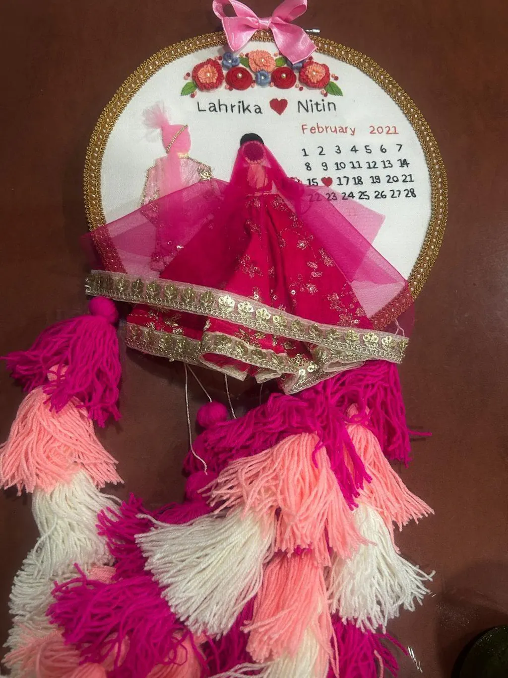 Make any dates memorable with these intricately embroidered Bride & Groom Calendar wall hanging. You can customize the couple's name and date on it and gift it your loved one in a unique way for an anniversary or wedding gift. The shade of red, baby pink & cream colored tassels complement the calendar hoop perfectly.
