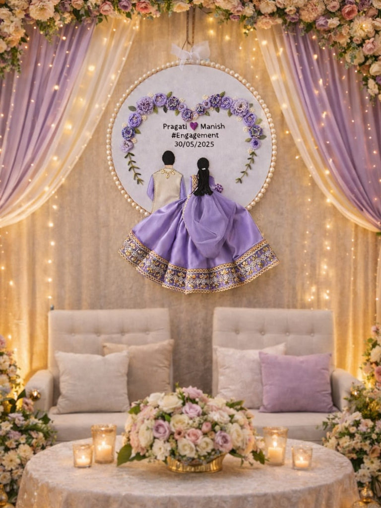 The bride’s dress is meticulously detailed with rich lavender brocade fabric and a delicate net dupatta, bringing the design to life. Finished with pearl edging and a sweet ribbon bow, this decor piece is perfect for engagement ceremonies, wedding gifts, or as a cherished memory for your home.