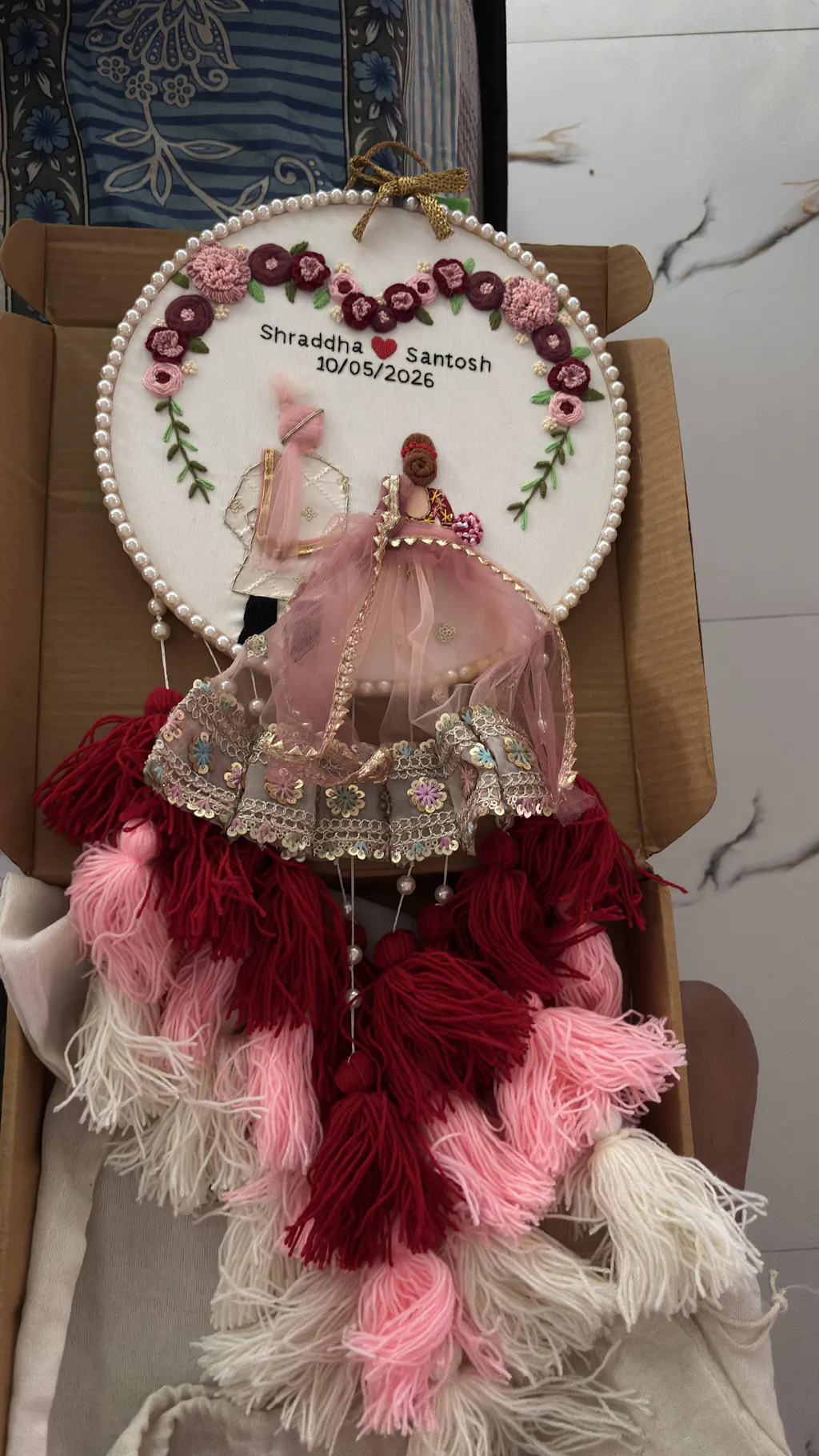 Make any dates memorable with these intricately embroidered Couple wall hanging. You can customize the couple's name and date on it and gift it your loved one in a unique way for an anniversary or wedding gift. The shade of maroon, baby pink and cream colored tassels complement the hoop perfectly.