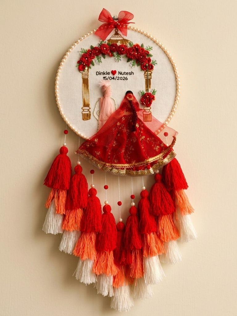 The bride’s dress is meticulously detailed with rich red fabric. Below, cascading layers of soft cotton tassels in red peach and cream add festive charm and texture. Finished with pearl edging and a sweet ribbon bow, this decor piece is perfect for engagement ceremonies, wedding gifts, or as a cherished memory for your home.