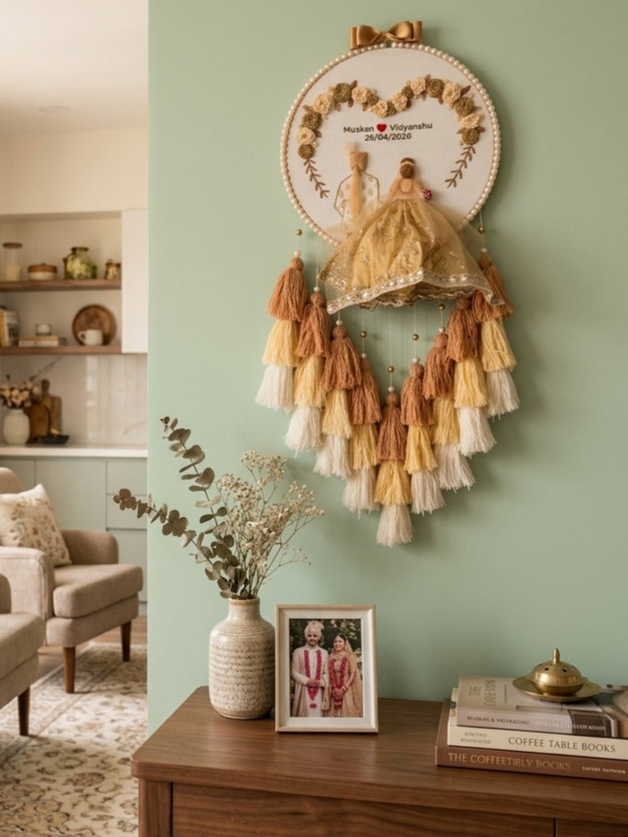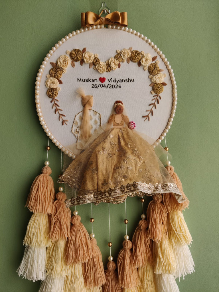Celebrate love and togetherness with this beautifully handcrafted personalized hoop wall hanging. Designed with intricate floral embroidery, elegant bead detailing, and charming tassel layers, this piece captures the essence of a timeless wedding memory.