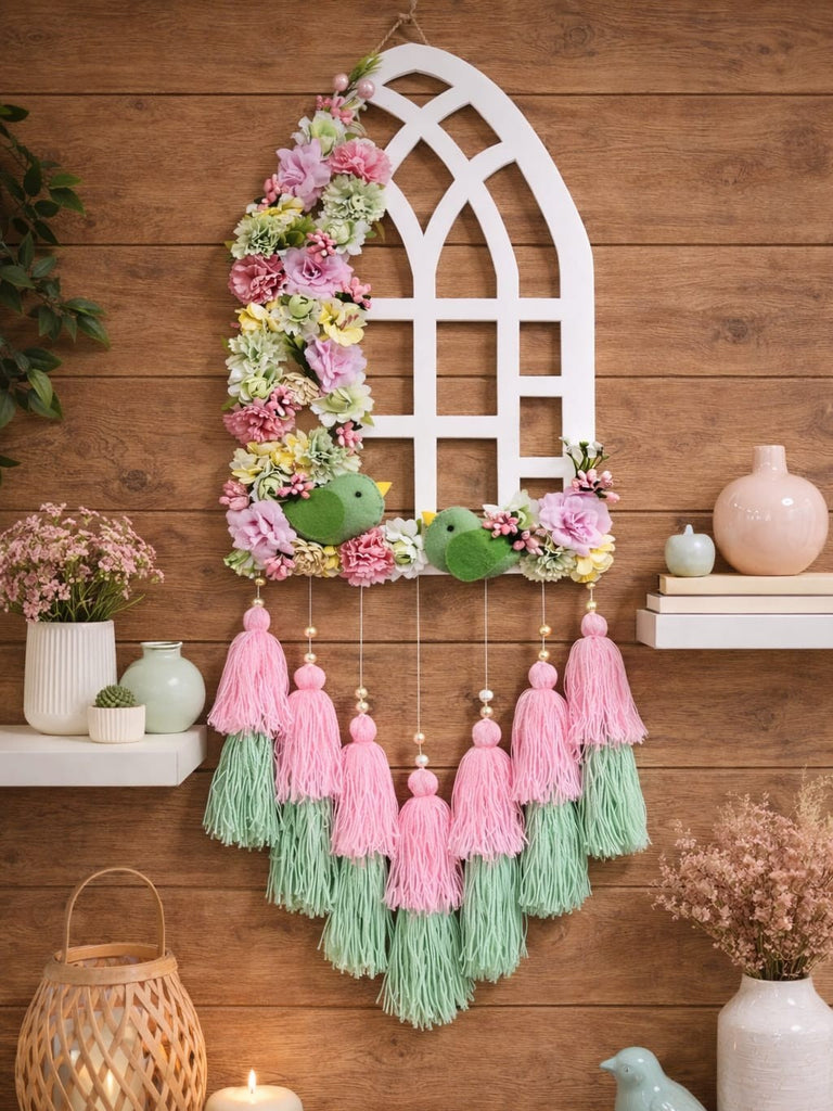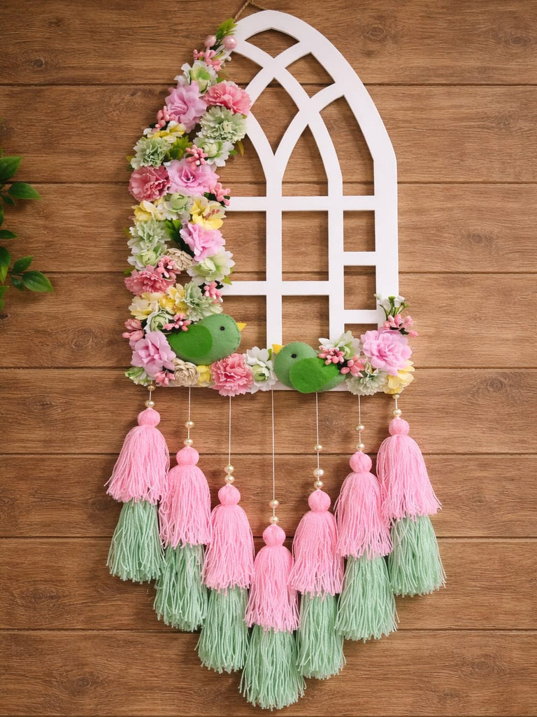 Add a touch of charm and freshness to your home with this beautifully handcrafted Jharoka Wall Hanging. Designed in the shape of a decorative window frame, this piece features delicate pastel flowers, adorable green birds, and layered tassels in soft pink and mint tones.