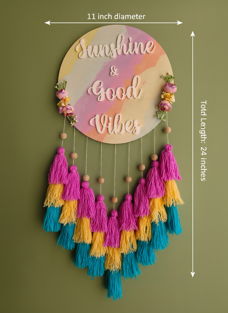 Add a burst of positivity to your space with our handcrafted “Sunshine & Good Vibes” Wall Hanging — a vibrant décor piece designed to instantly uplift any corner.